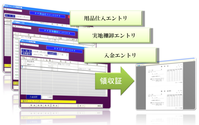 本システムでは、入金処理から領収書の発行、在庫管理まで対応しております。また、お客様のご要望に応じたカスタマズもお請けいたします。